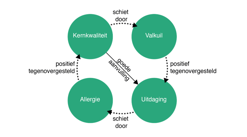 Het kernkwadrant, een model ontwikkeld door Daniel Ofman, brengt vier elementen samen: jouw kernkwaliteit, de bijbehorende valkuil (overdrive van de kwaliteit), de uitdaging (balans vinden) en de allergie (waar je je aan stoort bij anderen). Door deze vier te herkennen en benoemen, krijg je een scherp inzicht in je patronen. Je ontdekt niet alleen waar je kracht ligt, maar ook waar je nog in groei zit en welke situaties je energie kosten.